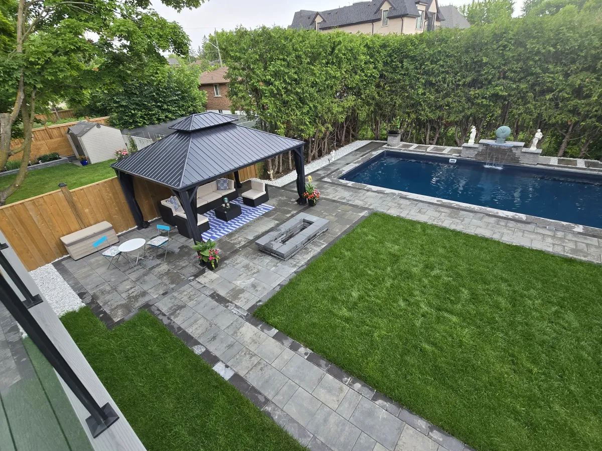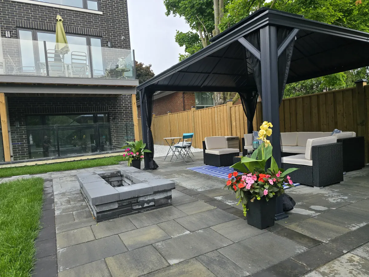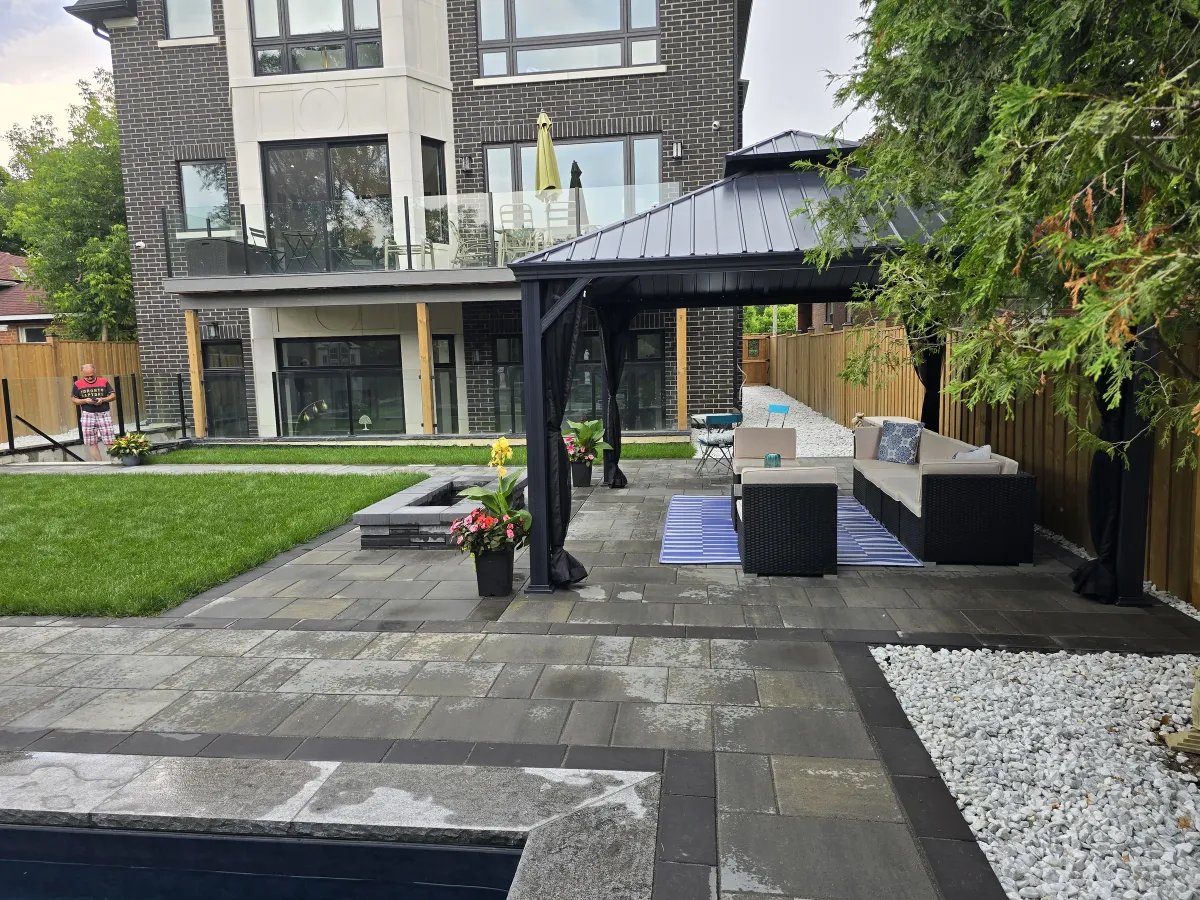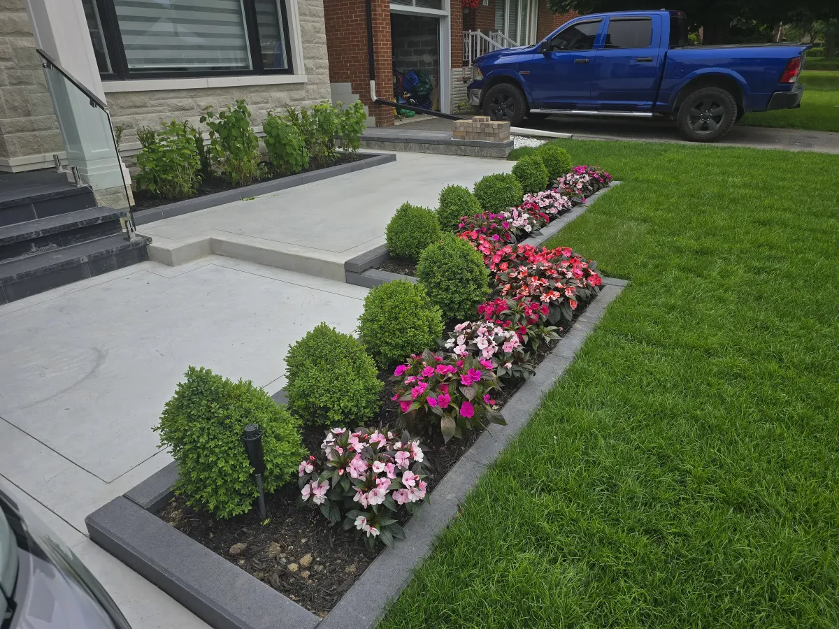 Designing and enhancing outdoor spaces, whether in the front yard or backyard, significantly boosts both the aesthetics and value of a property. Elements such as interlock driveways, retaining walls, luxury steps, and decorative flowerboxes create a welcoming and elegant entrance. In the backyard, a combination of large stone slabs with artificial grass, a cozy fire pit or fireplace, a modern barbecue area, and natural stone features like pool coping and armor stone can transform the space into a stylish and functional retreat. Adding lush greenery, triple mix, and mulch completes the look, ensuring a balanced and visually appealing outdoor environment.